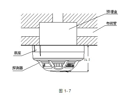 探測器安裝方式示意圖如圖1-7所示,接線盒可采用86H50型標準預埋盒。