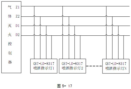 海灣GST-LD-8317噴灑燈與氣體滅火控制器的總線和電源 DC24V相連,實(shí)現(xiàn)噴灑噴灑功能。具體連接方法如圖 5- 17 所示。