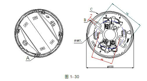 待定位底座安裝牢固后,將探測器底部上的對位標(biāo)識A對準(zhǔn)定位底座B處,將探測器順時針旋轉(zhuǎn)到定位底座C處即可安裝好探測器,探測器底部及定位底座示意圖如圖1-30所示。