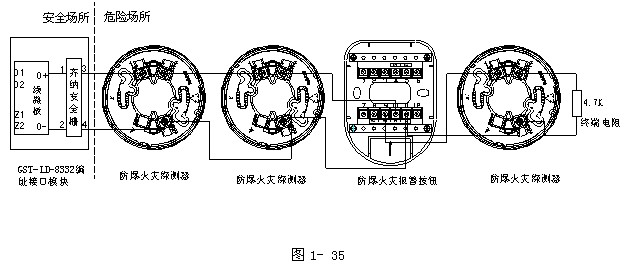 編址接口模塊可與防爆的感溫火災(zāi)探測器、感煙火災(zāi)探測器及手動火災(zāi)報警按鈕一起接入火災(zāi)報警控制器系統(tǒng)中組成本安型防爆系統(tǒng)。在系統(tǒng)連線末端必須連接一4.7kΩ終端電阻,且一只編址接口模塊混接的各類防爆探測器及報警探測不能超過10只。系統(tǒng)連線如圖1- 35所示。