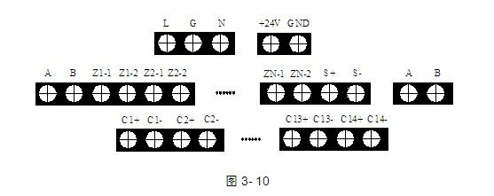 本控制器為壁掛式結構設計,可直接明裝在墻壁上,其對外接線端子示意圖如下圖:其中: