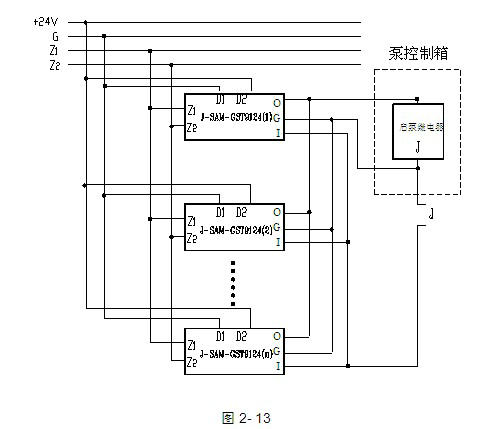 當(dāng)設(shè)備啟動電流大于100mA時,應(yīng)通過GST-LD-8302切換模塊進(jìn)行轉(zhuǎn)換,通過GST-LD-8302轉(zhuǎn)換直接啟泵方式應(yīng)用示意圖如圖2-14所示: