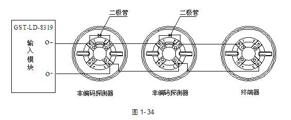GST-LD-8319輸入模塊與非編碼探測器串聯(lián)連接時,探測器的底座上應(yīng)接二極管1N5819,且輸出回路終端必須接GST-LD-8320或GST-LD-8320A終端器,終端器可當(dāng)探測器底座使用,即在此終端器上可安裝非編碼探測器,其系統(tǒng)構(gòu)成圖如圖1-34: