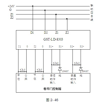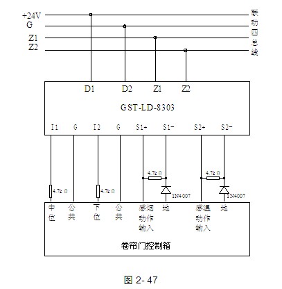a.模塊與防火卷簾門電氣控制箱(標(biāo)準(zhǔn)型)接線示意圖如圖2-46(無源常開檢線輸入)、圖2-47所示(無源常閉檢線輸入):