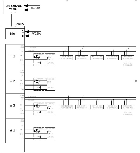 +24V、GND:各區(qū)的輔助電源輸出端子,為現(xiàn)場(chǎng)的系統(tǒng)設(shè)備如聲光警報(bào)器、氣體噴灑指示燈和輸出模塊供電。