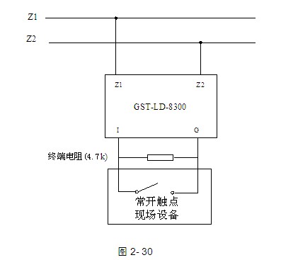 GST-LD-8300型海灣輸入模塊與具有常閉無(wú)源觸點(diǎn)的現(xiàn)場(chǎng)設(shè)備連接方法如圖2-31所示,模塊輸入設(shè)定參數(shù)設(shè)為常閉檢線。