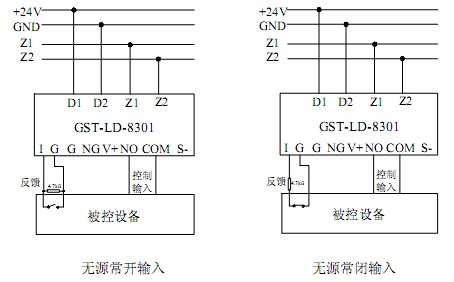 b.模塊無源輸出觸點控制設(shè)備的接線示意圖如圖2-35(無源常開檢線輸入)、圖2-36所示(無源常閉檢線輸入):