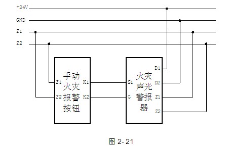 可以利用手動(dòng)火災(zāi)報(bào)警按鈕的無源常開觸點(diǎn)直接控制編碼型的火災(zāi)聲光警報(bào)器啟動(dòng),系統(tǒng)接線示意圖如圖2-21: